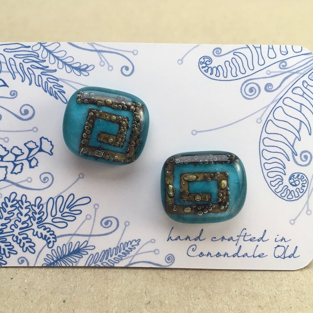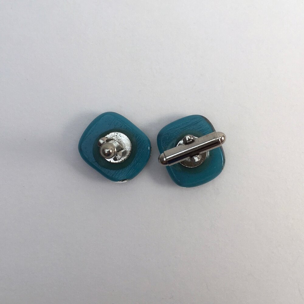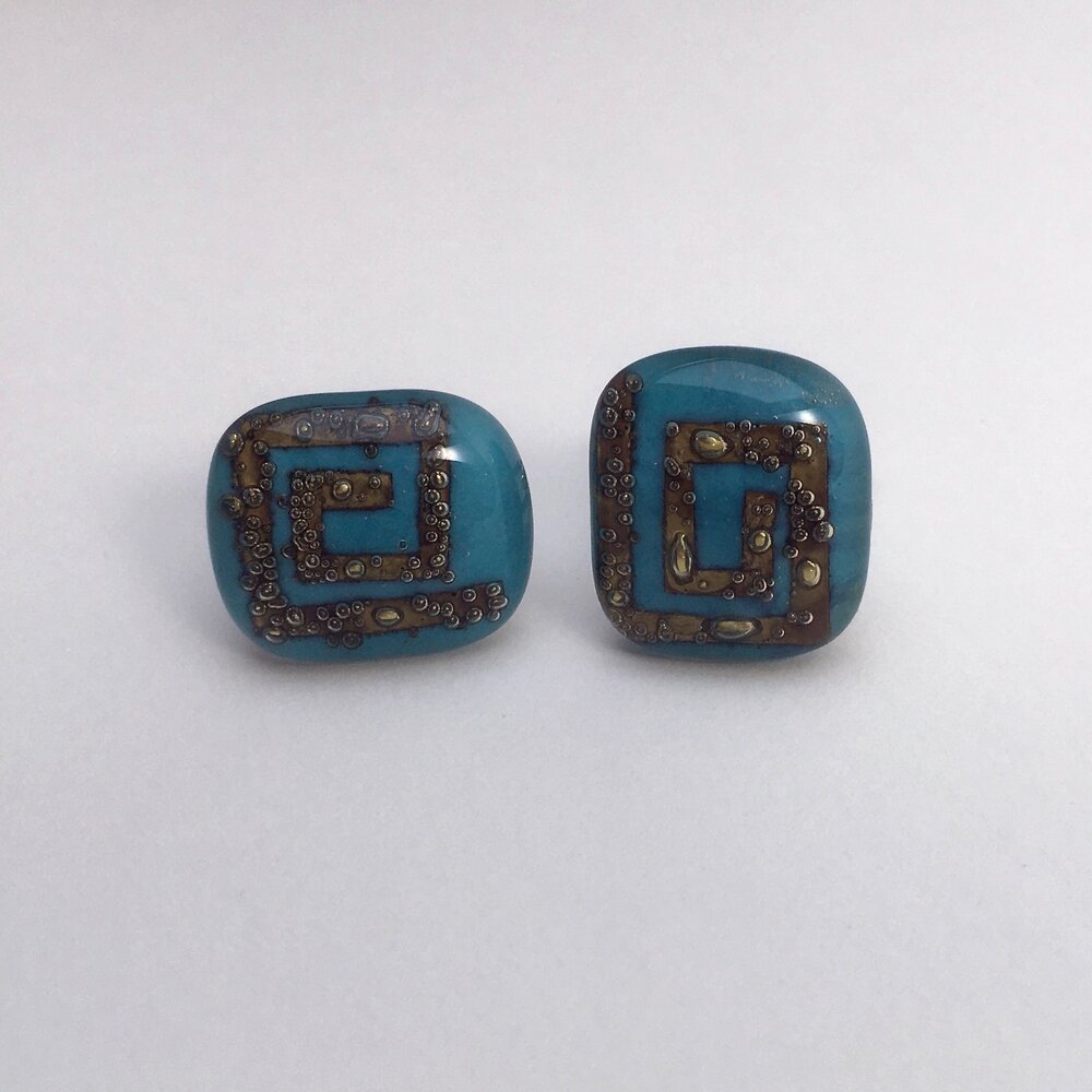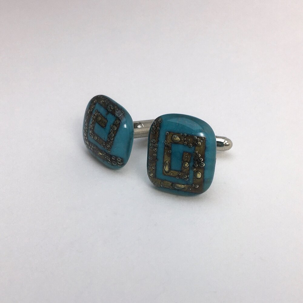A unique pair of cufflinks with an embedded brass spiral. The thin brass shim was cut by hand into a square-spiral shape and fused between the layers of glass. Stainless steel fittings.