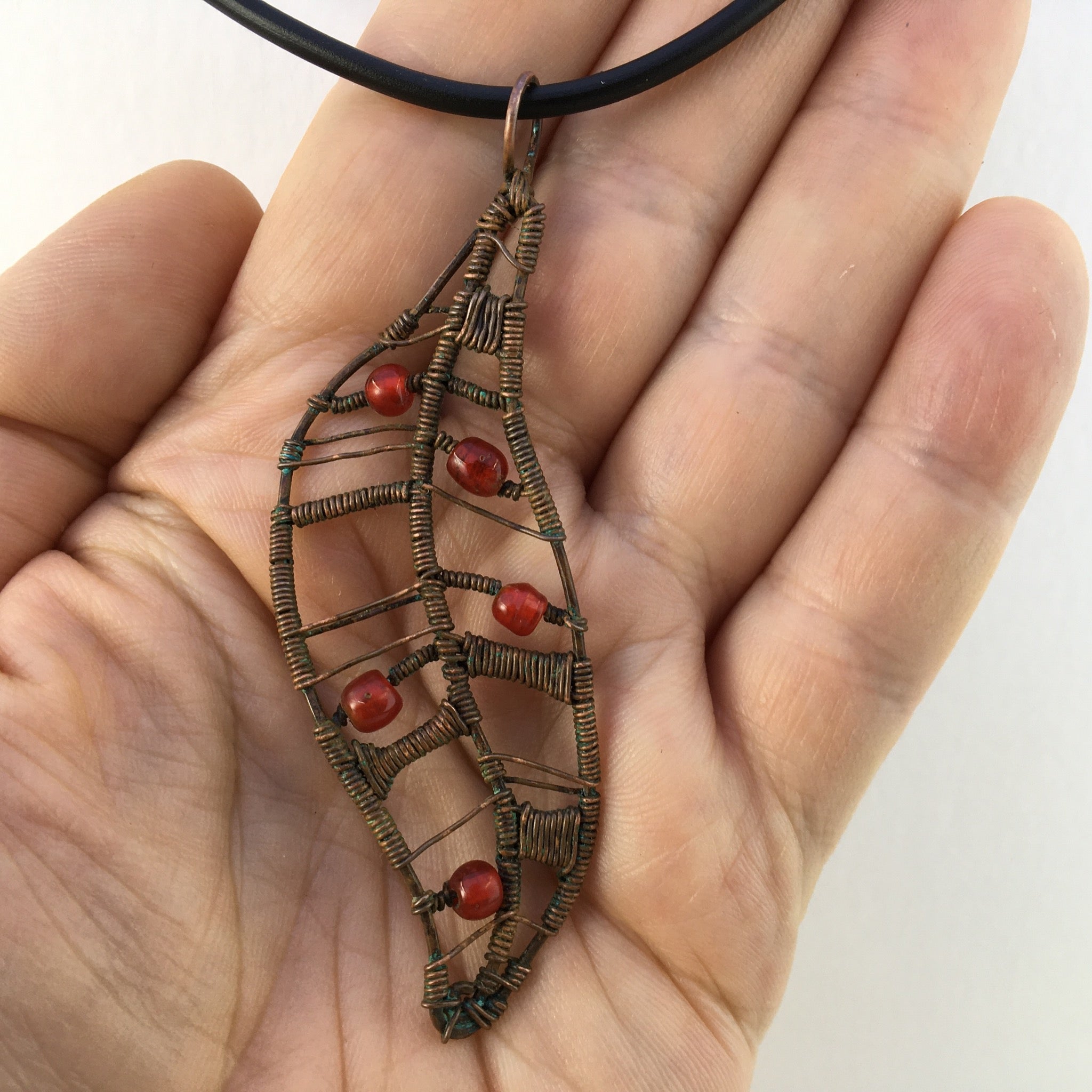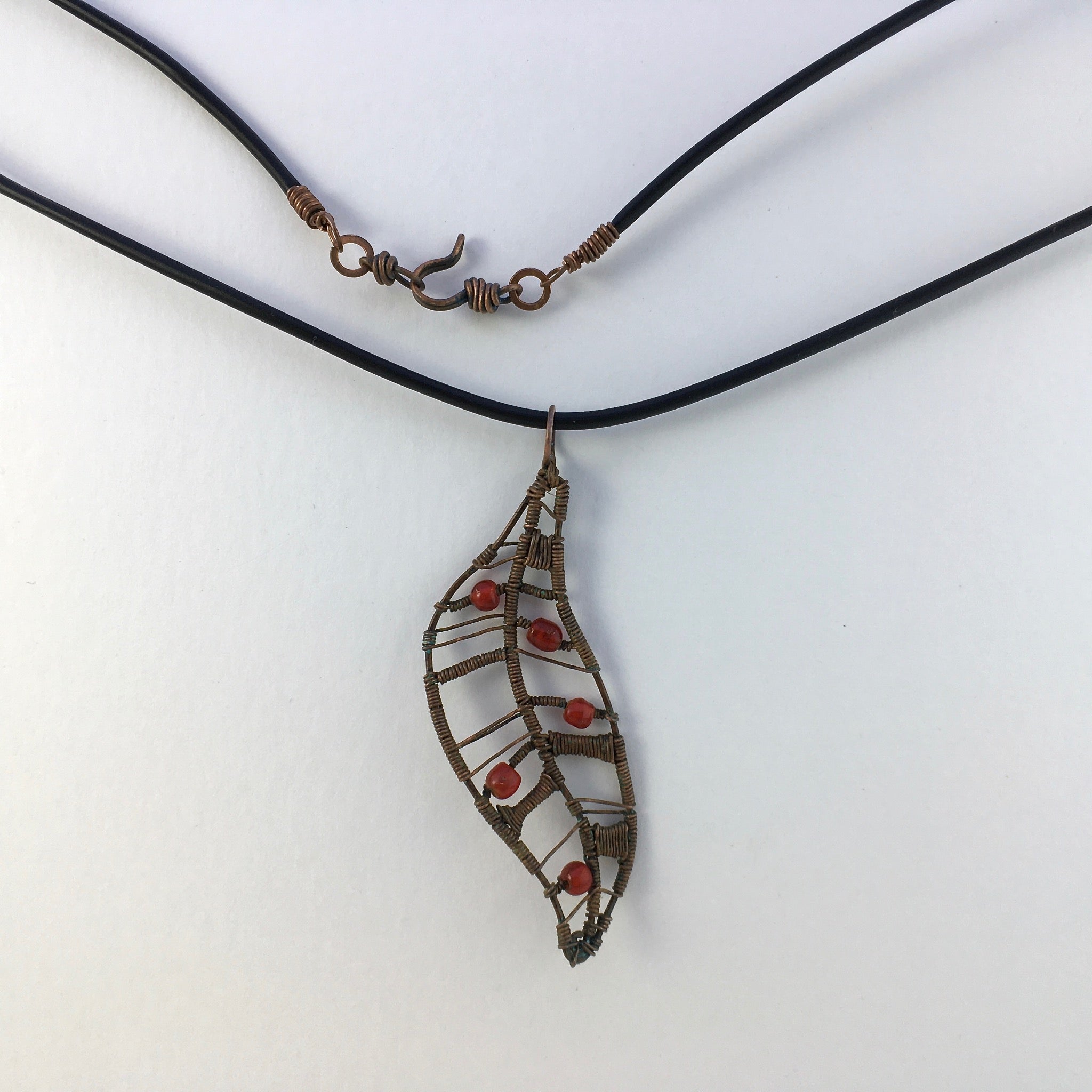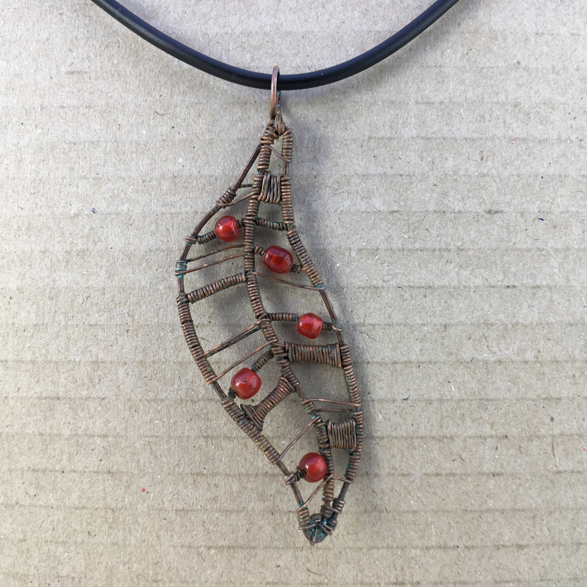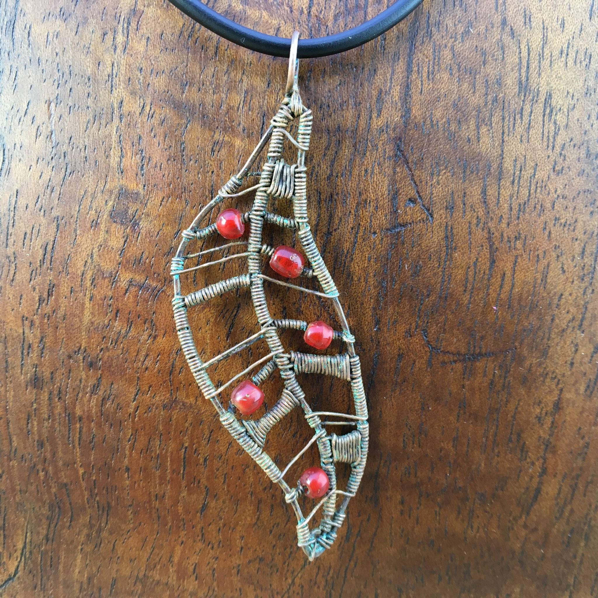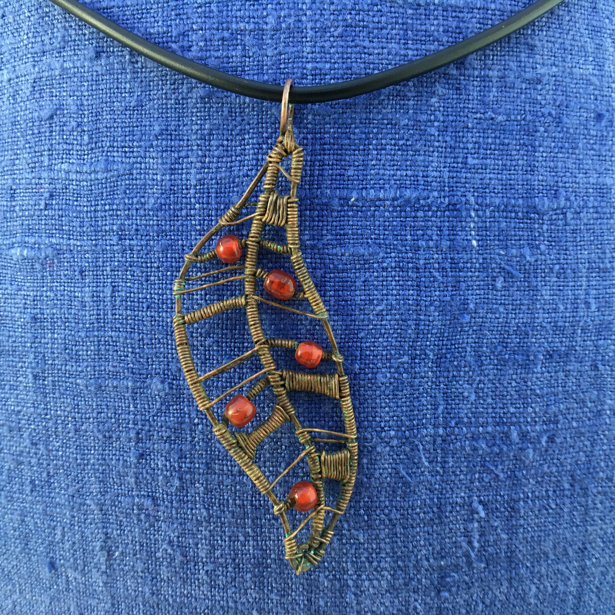 This rustic wire-wrapped pendant was inspired by leaves falling from gum trees in our paddock. It was hand-crafted using reclaimed copper wire and glass seed beads.