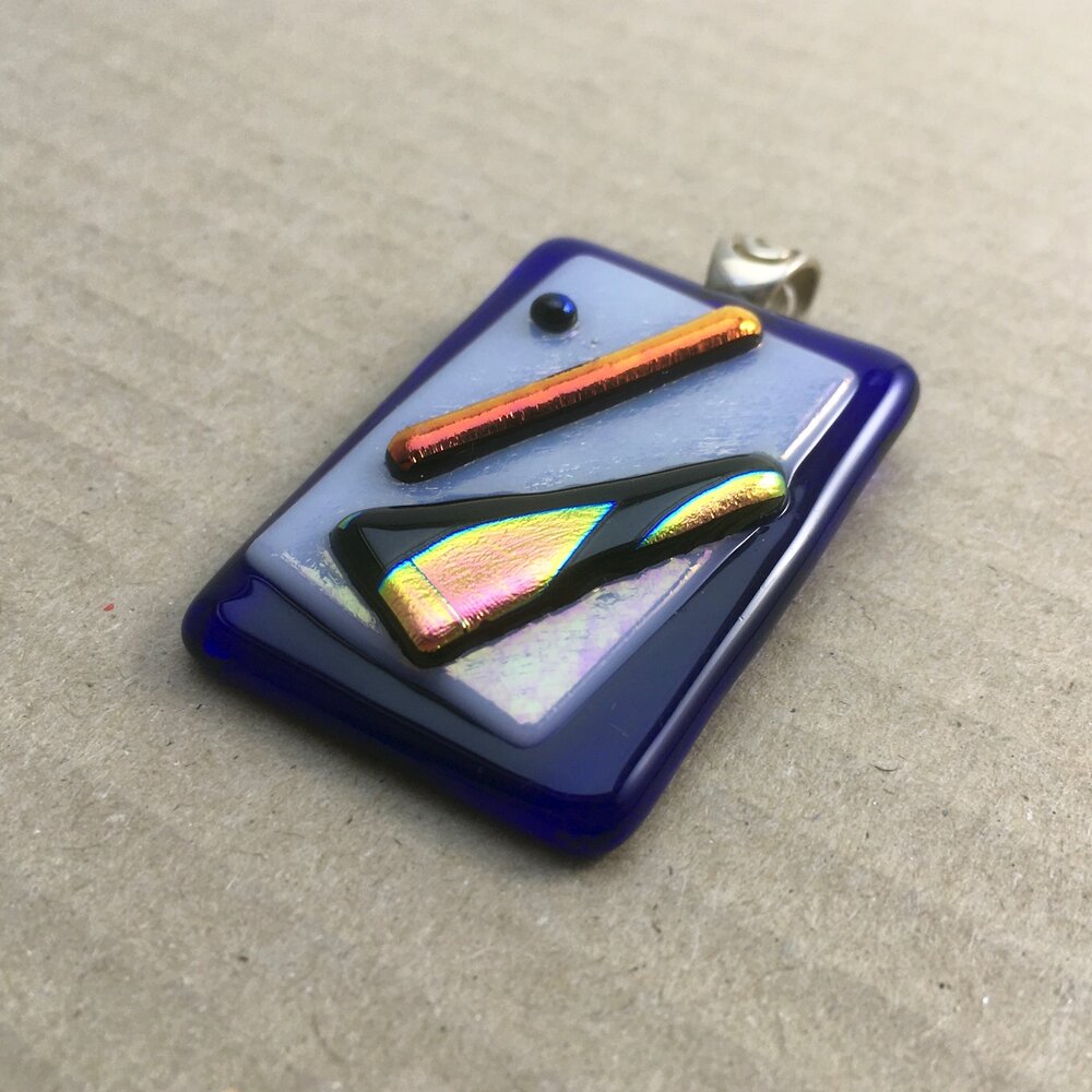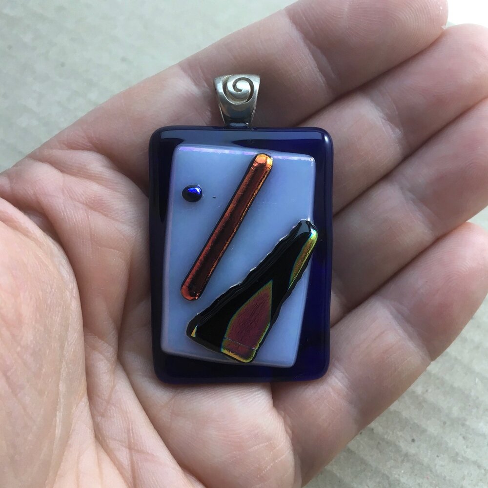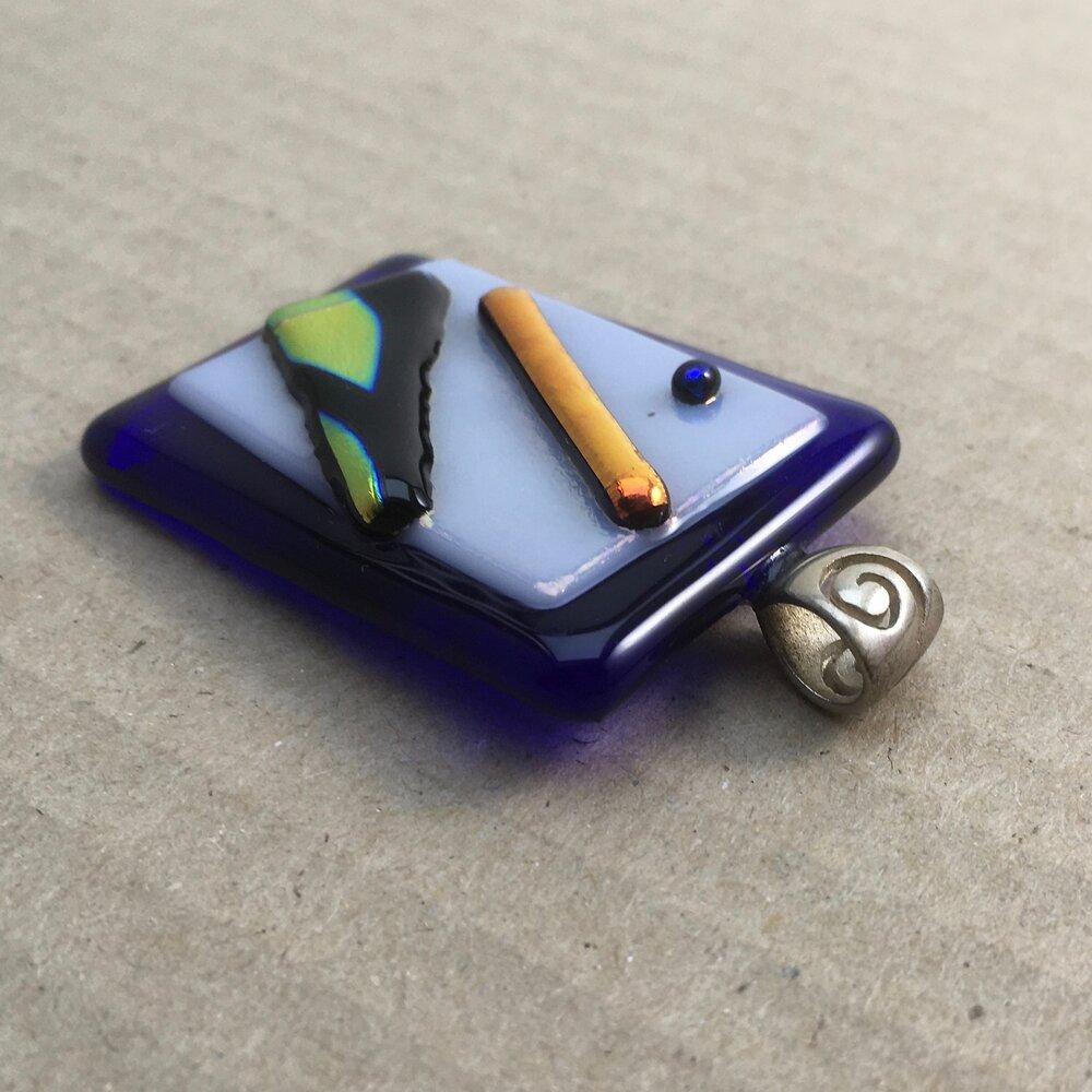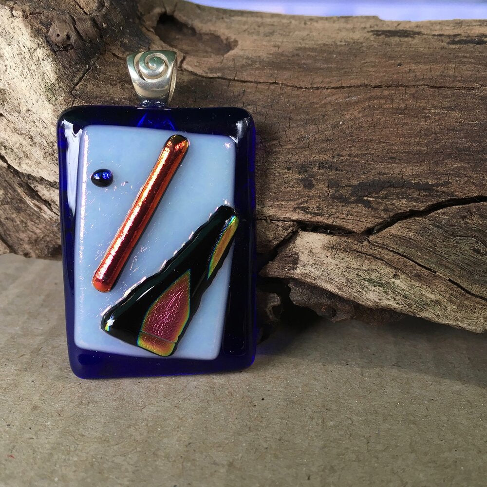 A unique fused-glass pendant with three odd dichroic shapes on a white and blue background. Sterling silver spiral bail.