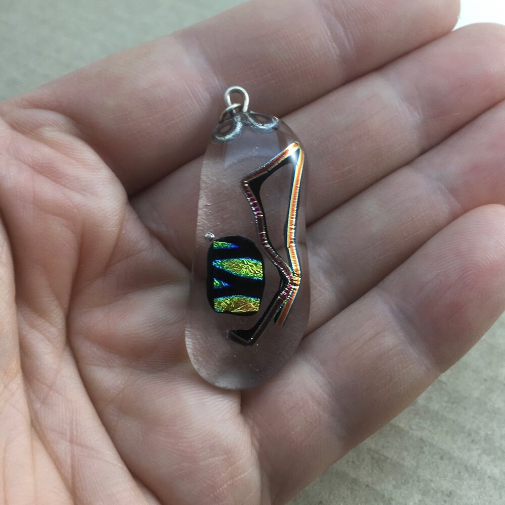 A unique fused-glass pendant with dichroic shards on a clear backing. A small loop of sterling silver wire was fused between the layers of glass for hanging.