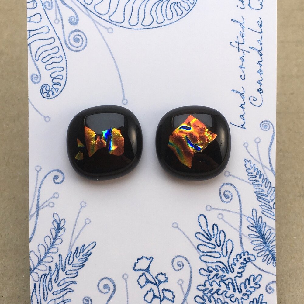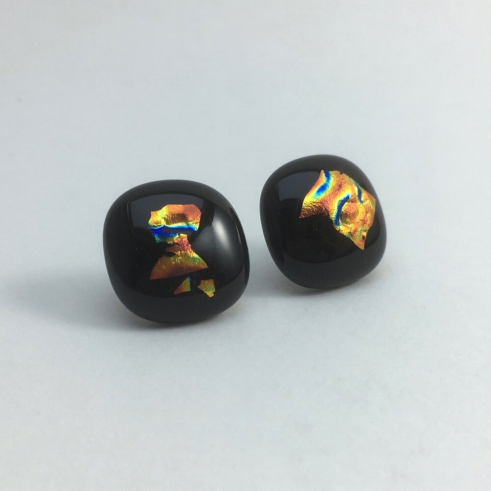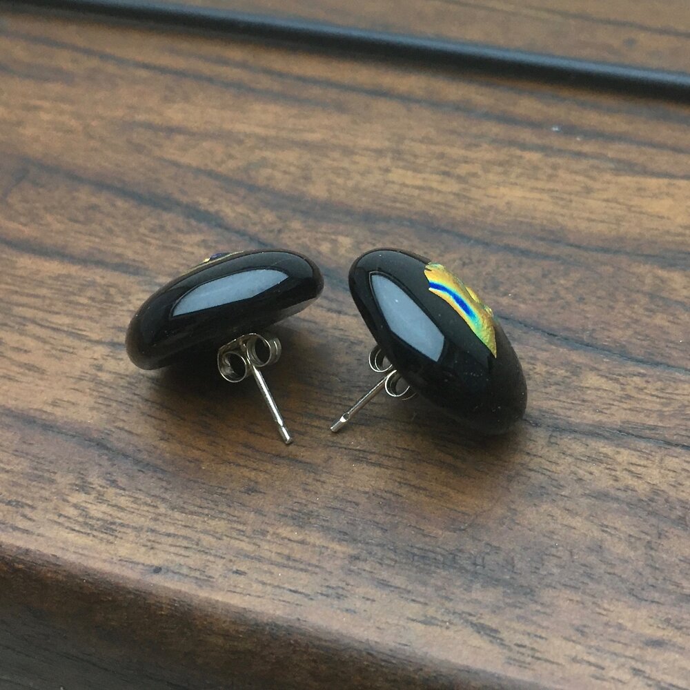 A unique pair of button studs with bronze/green/blue dichroic pieces embedded. Sterling silver posts & clips.