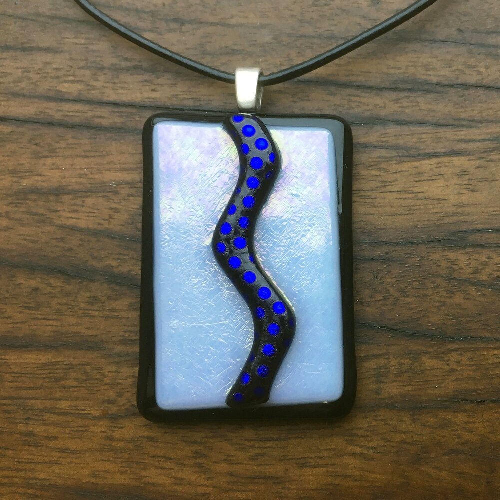 A unique fused-glass pendant with a spotty dichroic zig-zag on a dichroic white background with back border. Sterling silver bail.