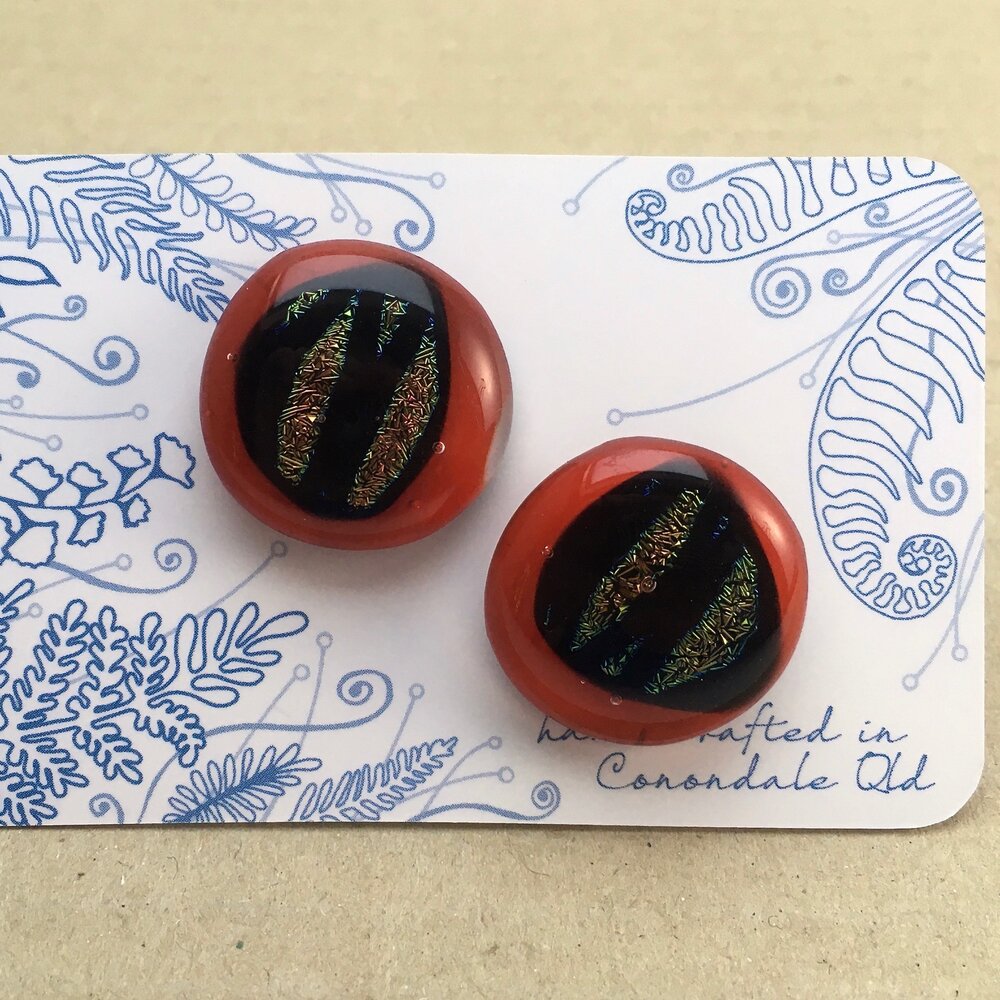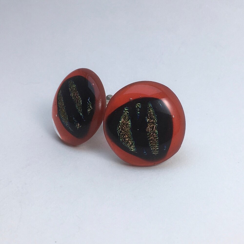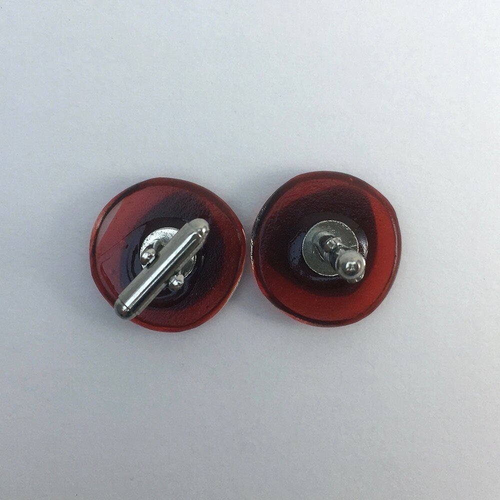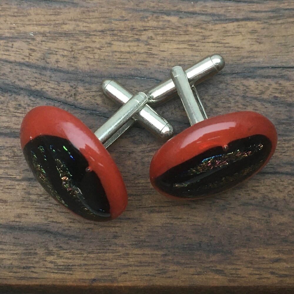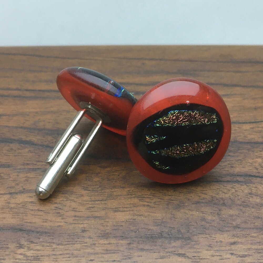 A unique pair of round, red cufflinks with sparkling bronze dichroic slits in an abstract pupil shape. Stainless steel fittings.