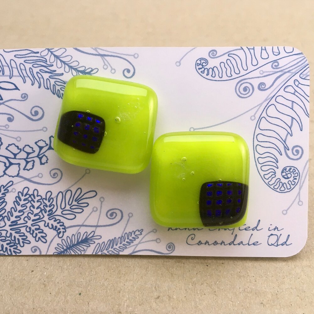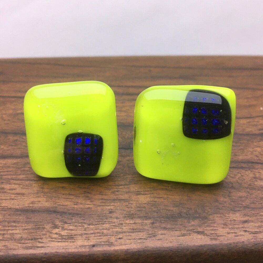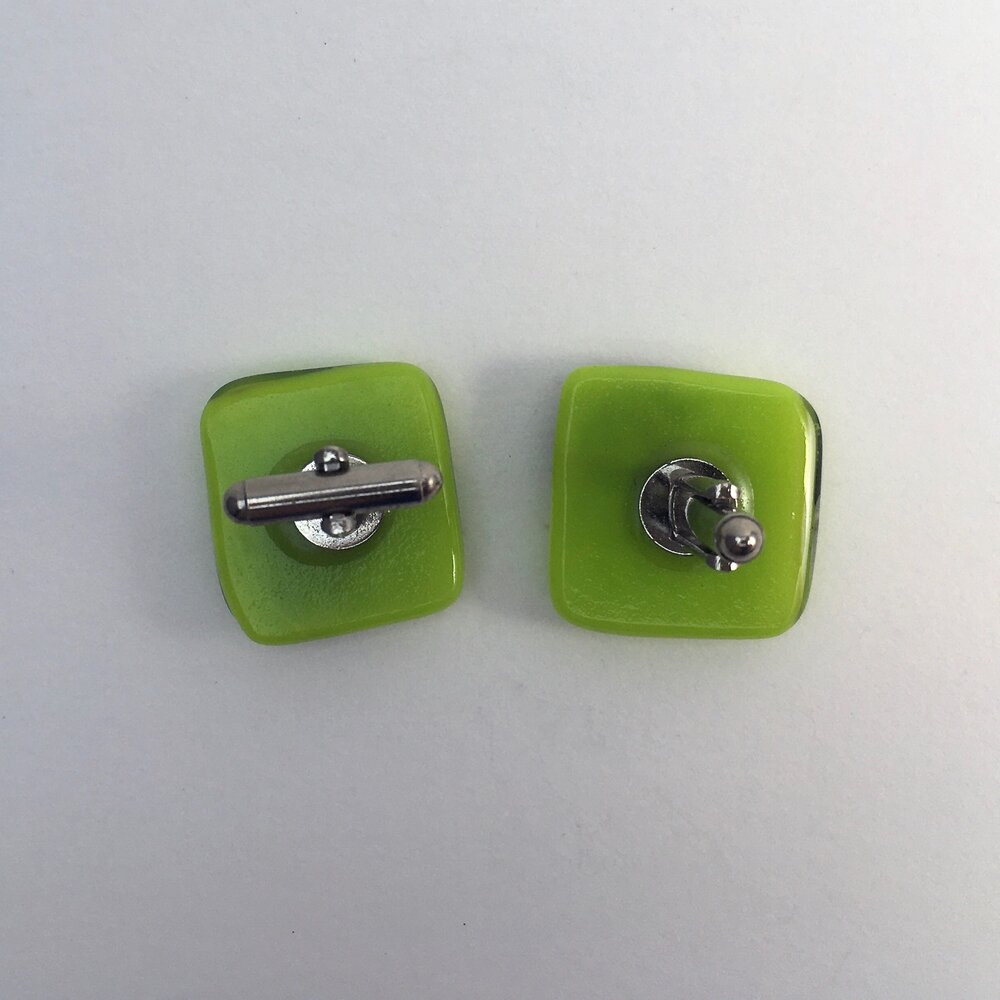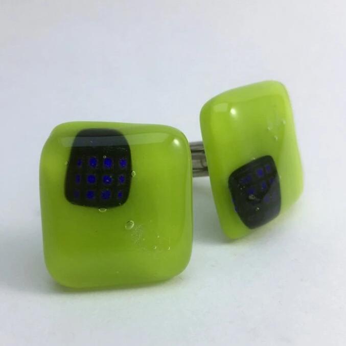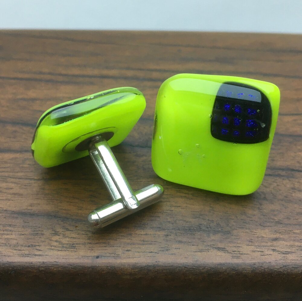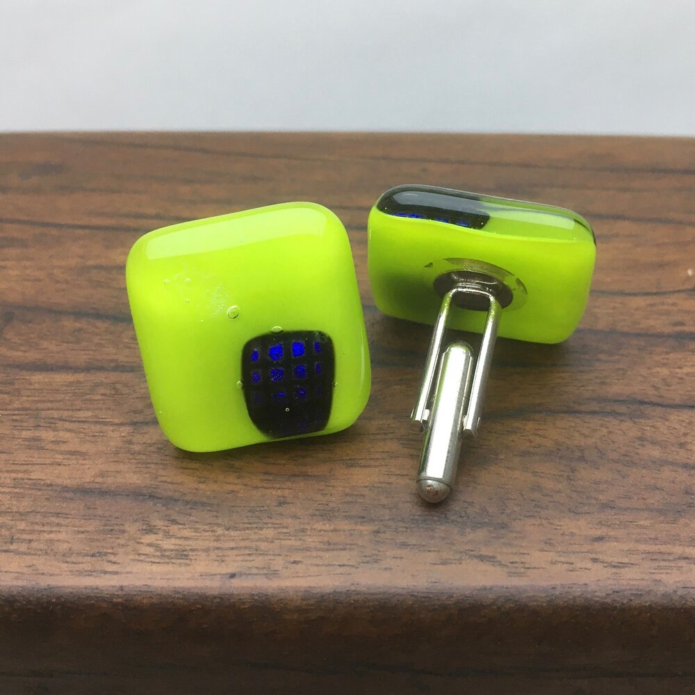 A unique pair of cufflinks with blue dichroic squares on a lime green background. Stainless steel fittings.