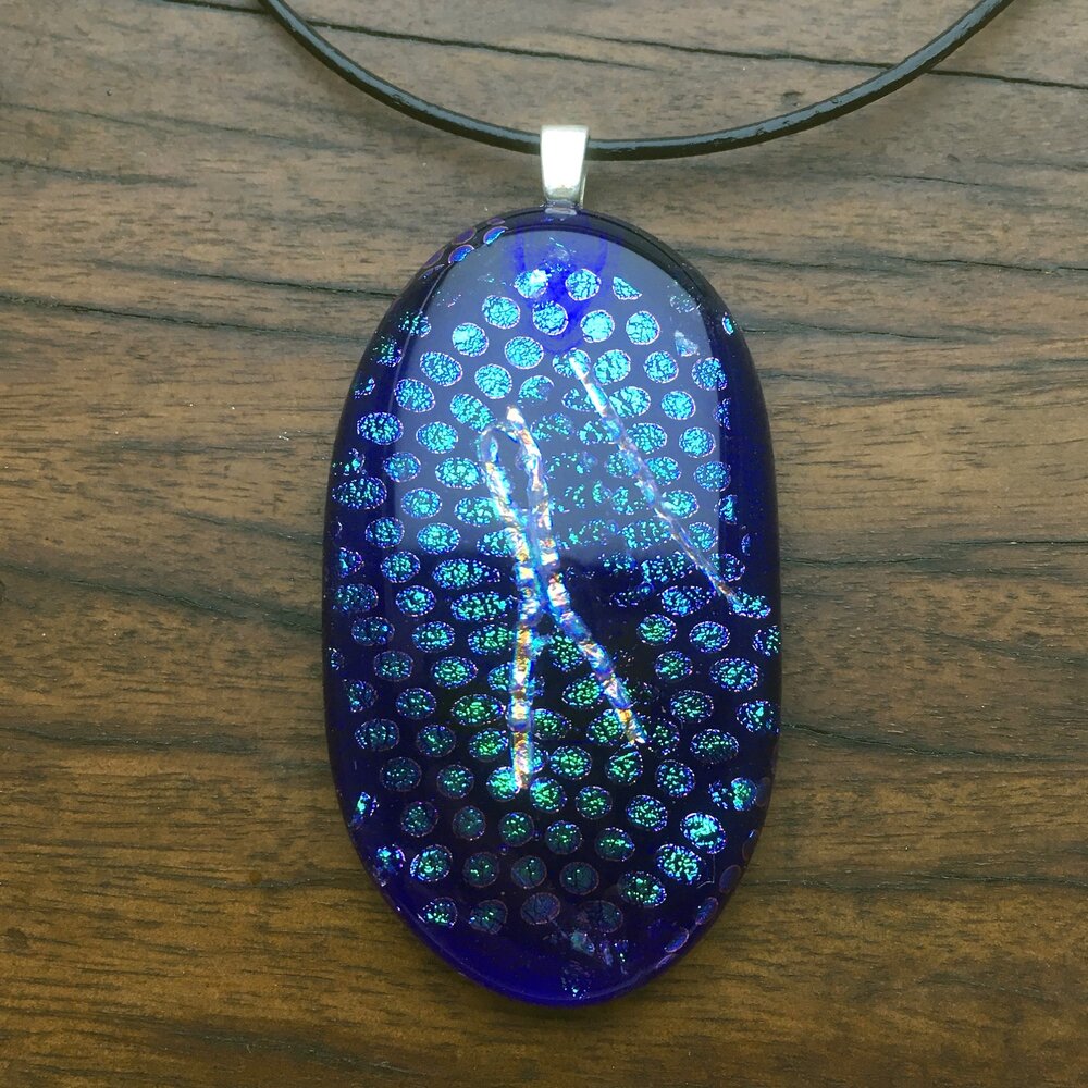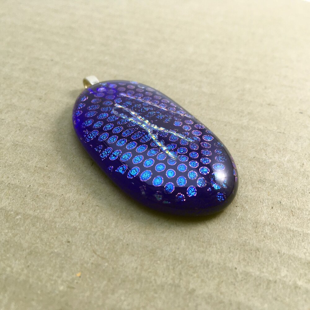 A unique oval-shaped fused-glass pendant with dichroic blue spots and a silver ribbon. Sterling silver bail.
