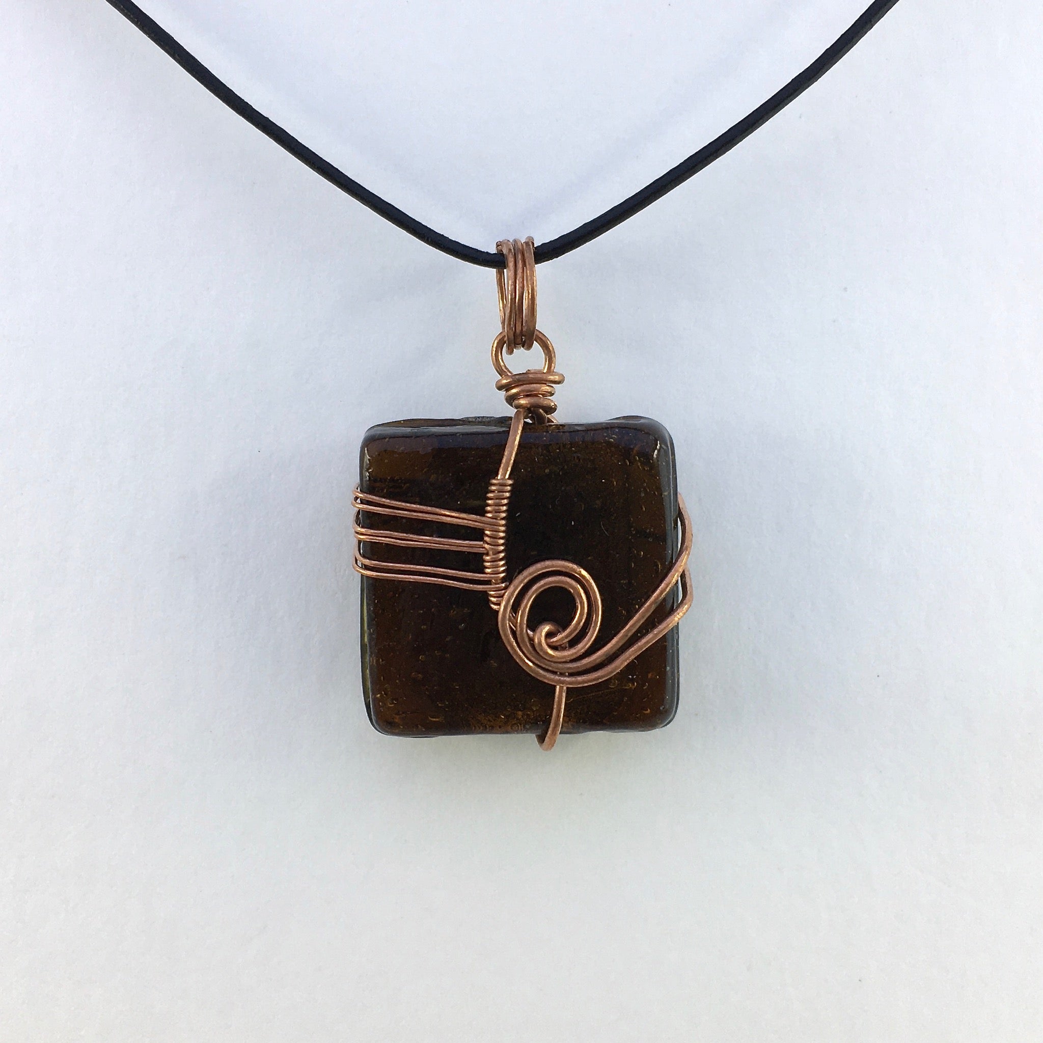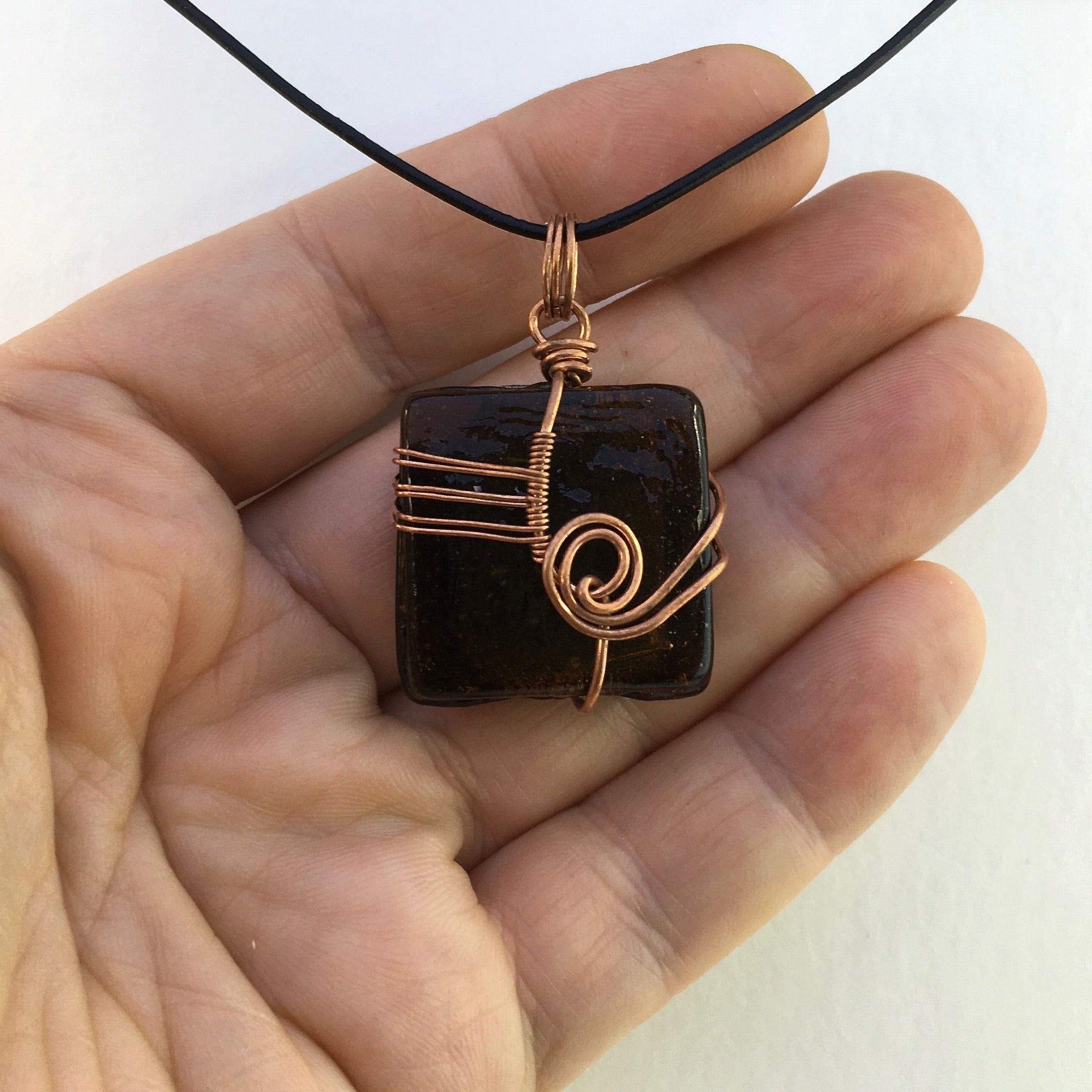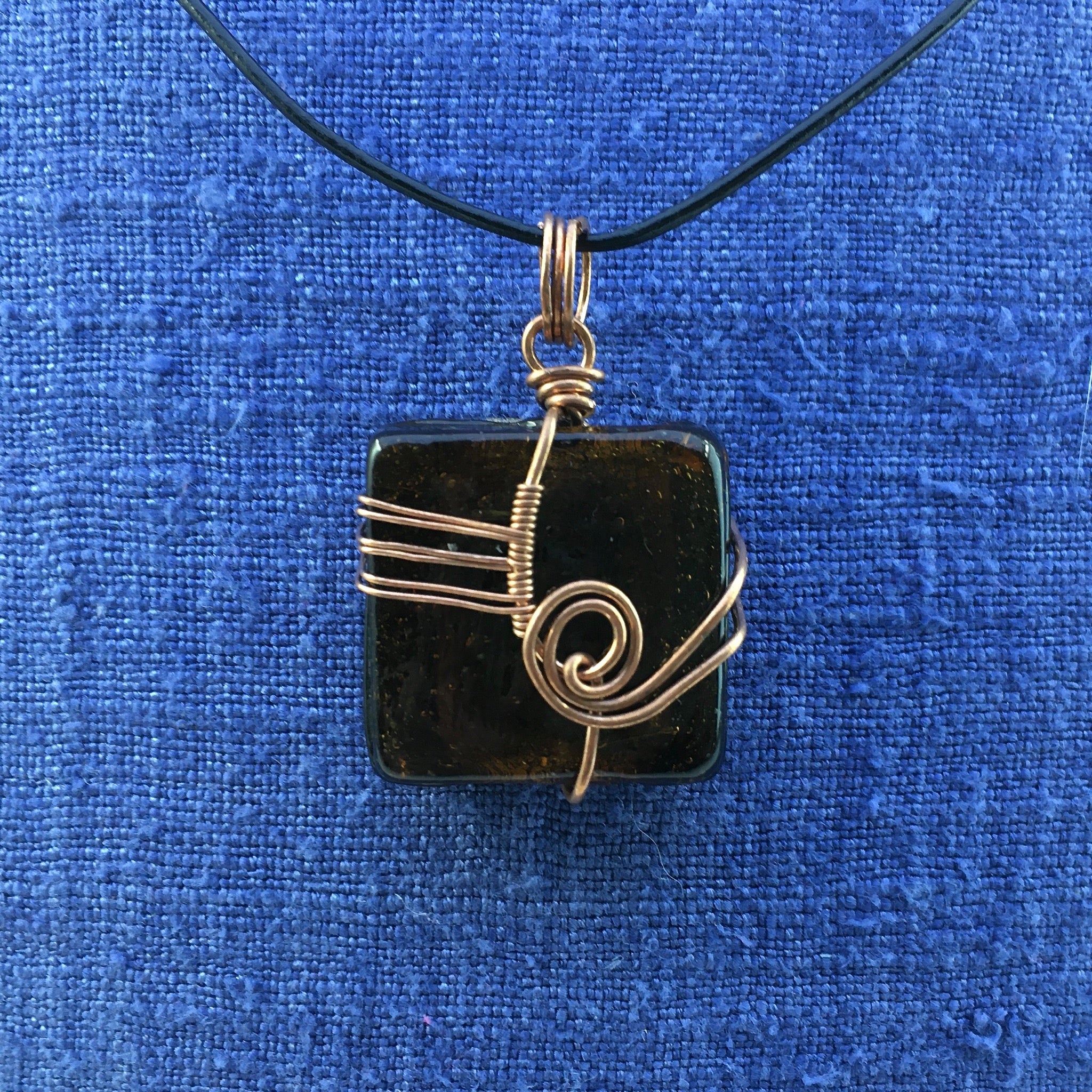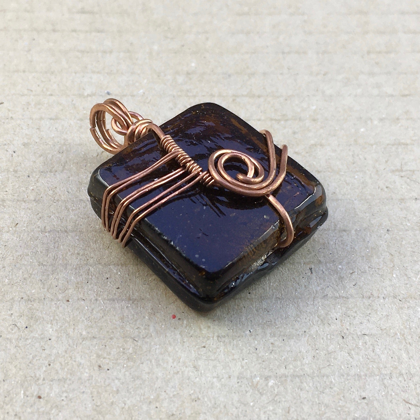 This pendant was hand-crafted using reclaimed copper wire and a foiled-glass bead.