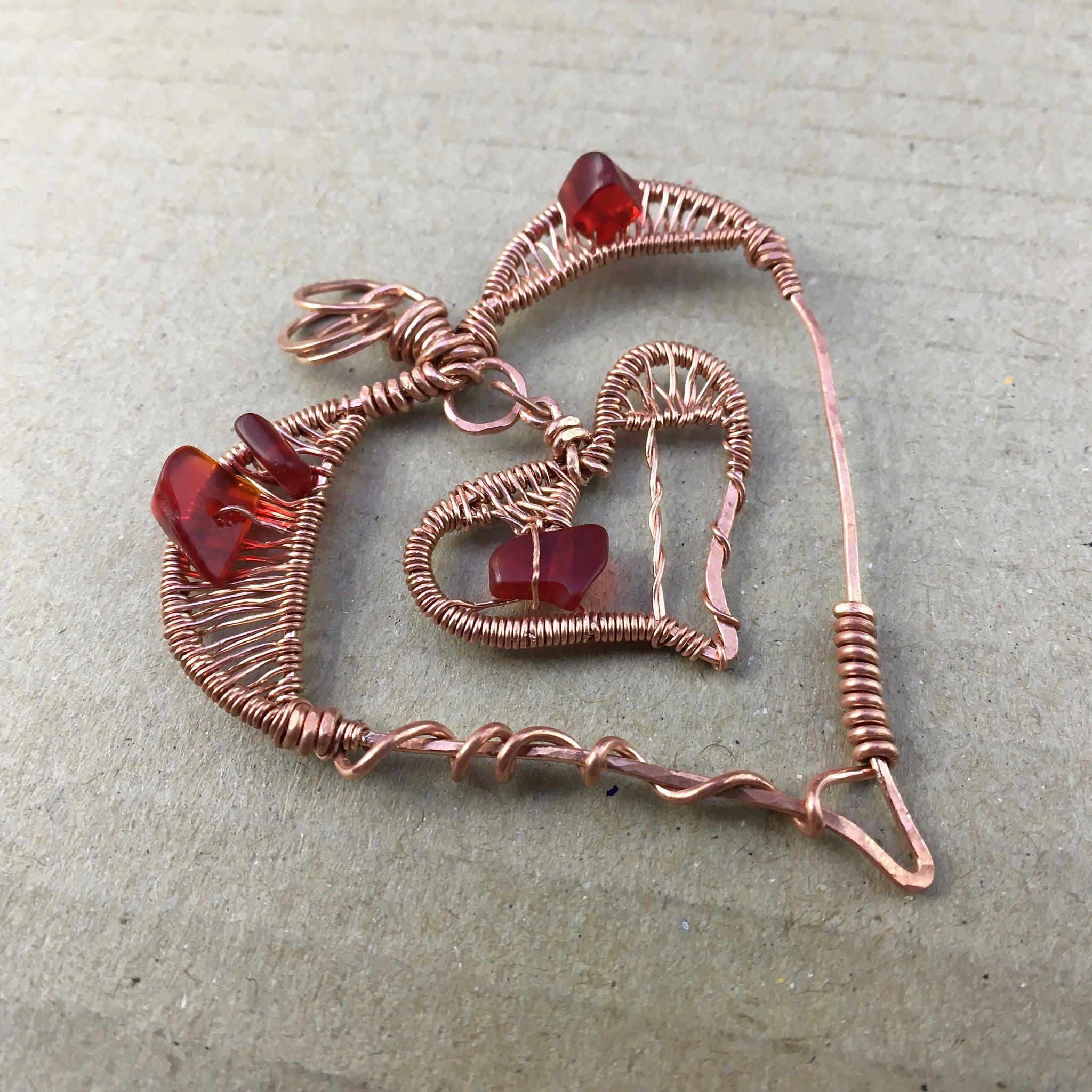 This wire-wrapped pendant was hand-made using solid copper wire and semi-precious stone chips. It is 5.5 cm wide and would make a wonderful mother’s day gift.