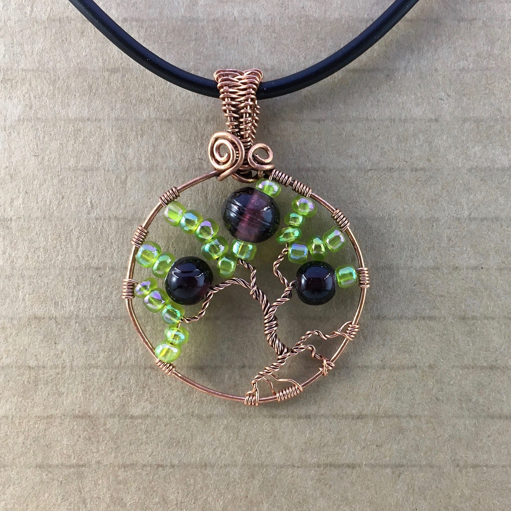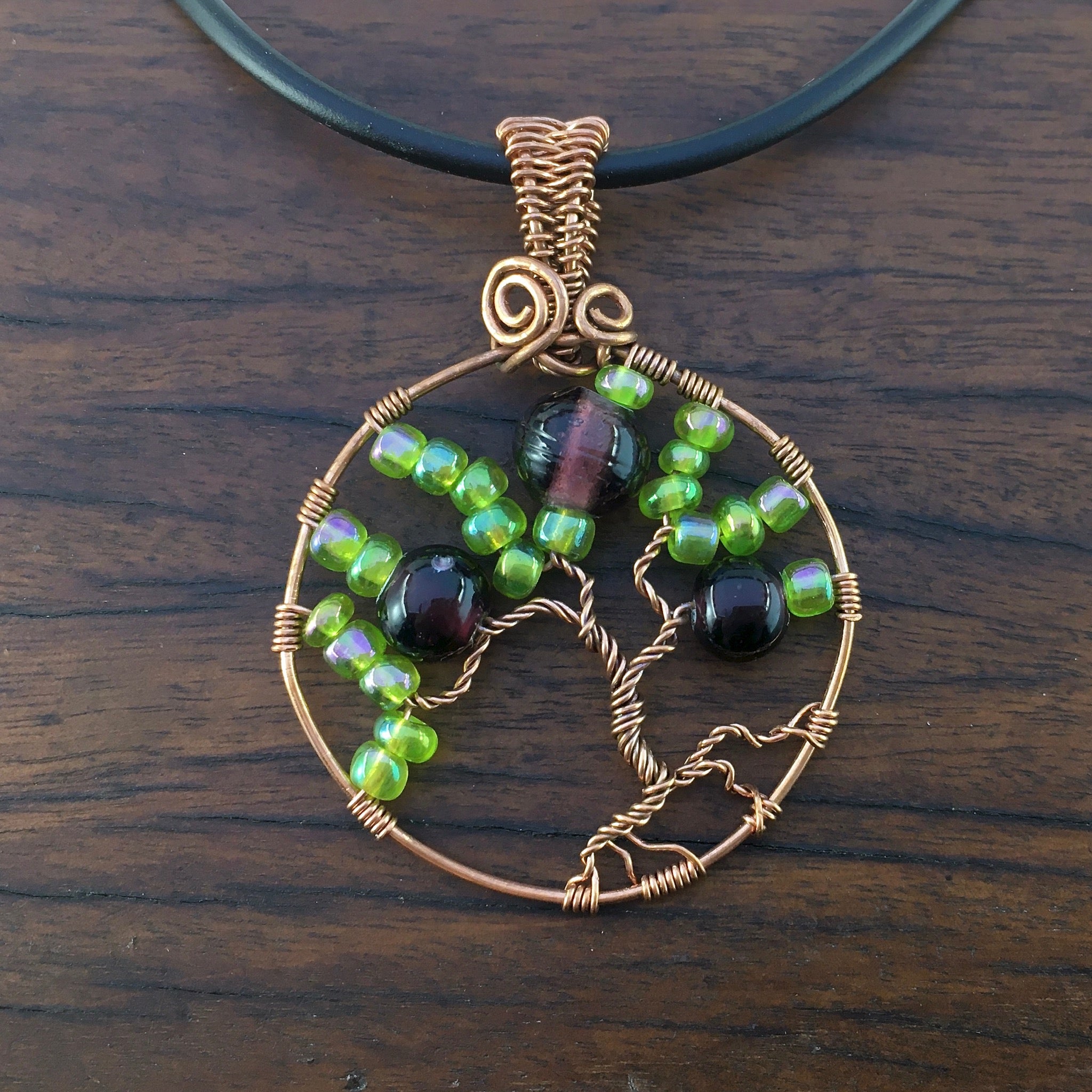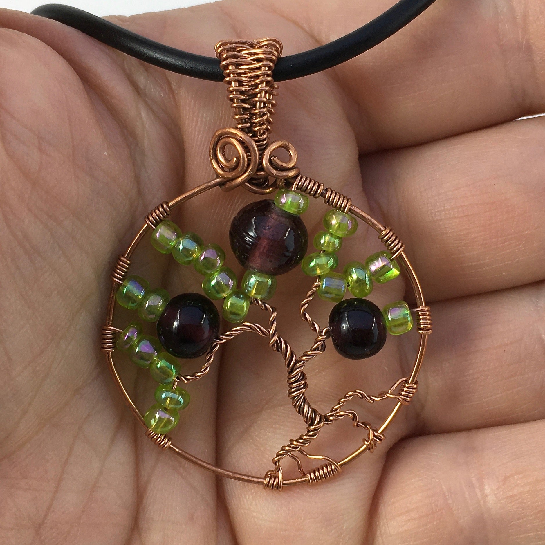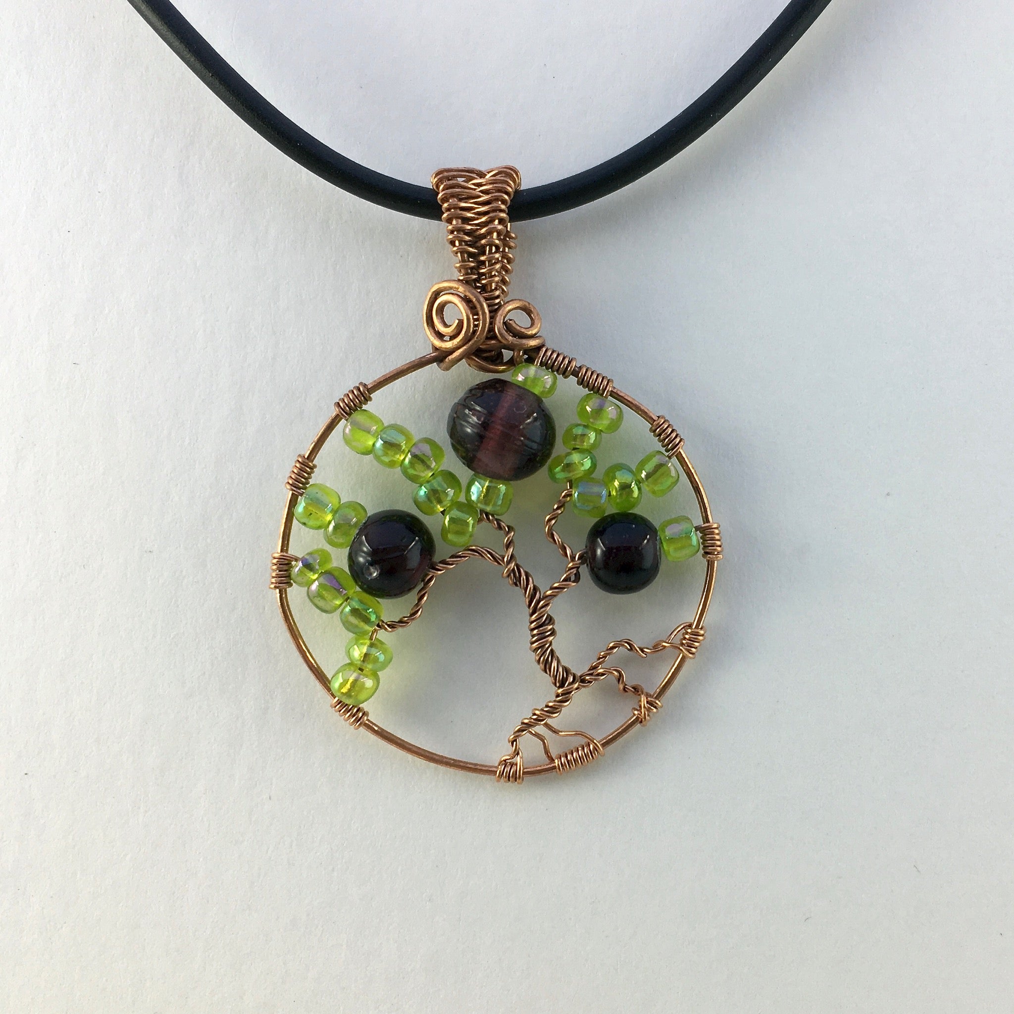 This tree-of-life pendant was hand-crafted using reclaimed copper wire, glass seed beads and hand-blown glass beads.