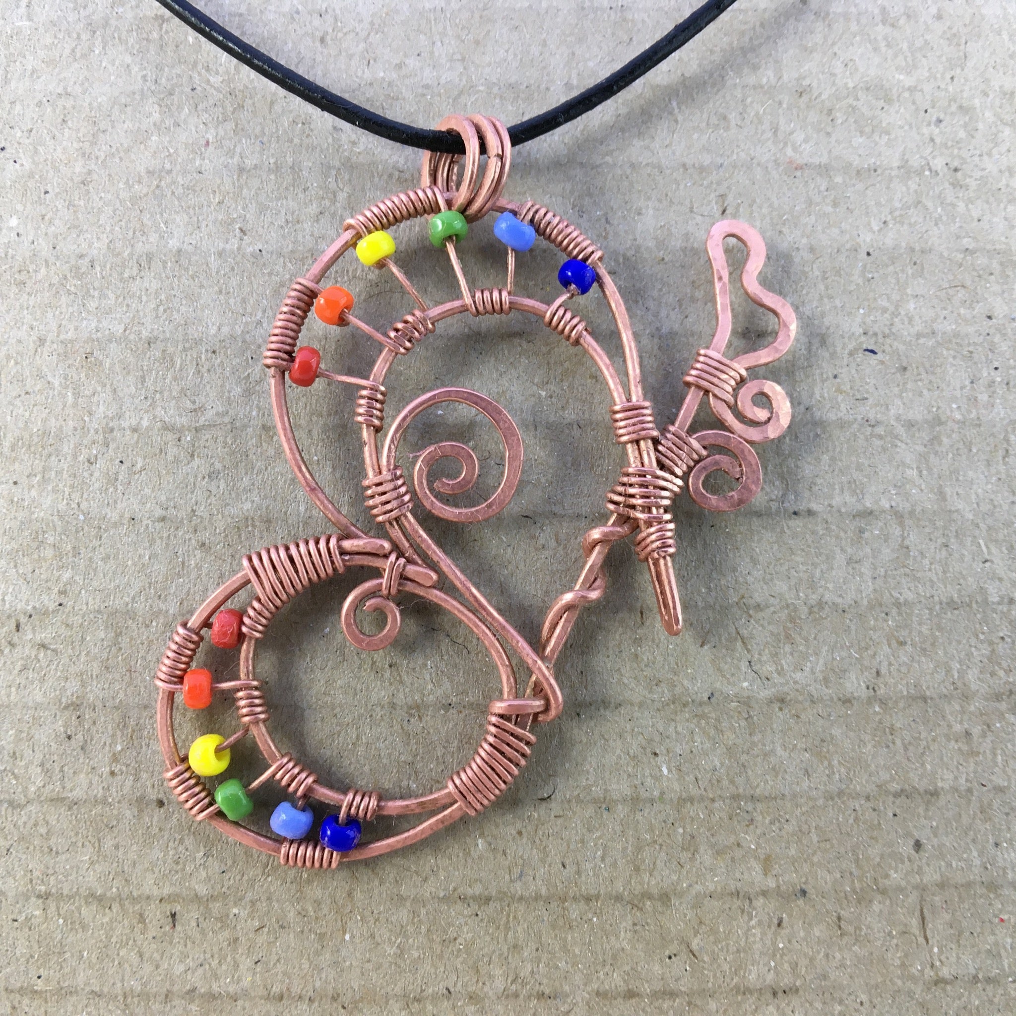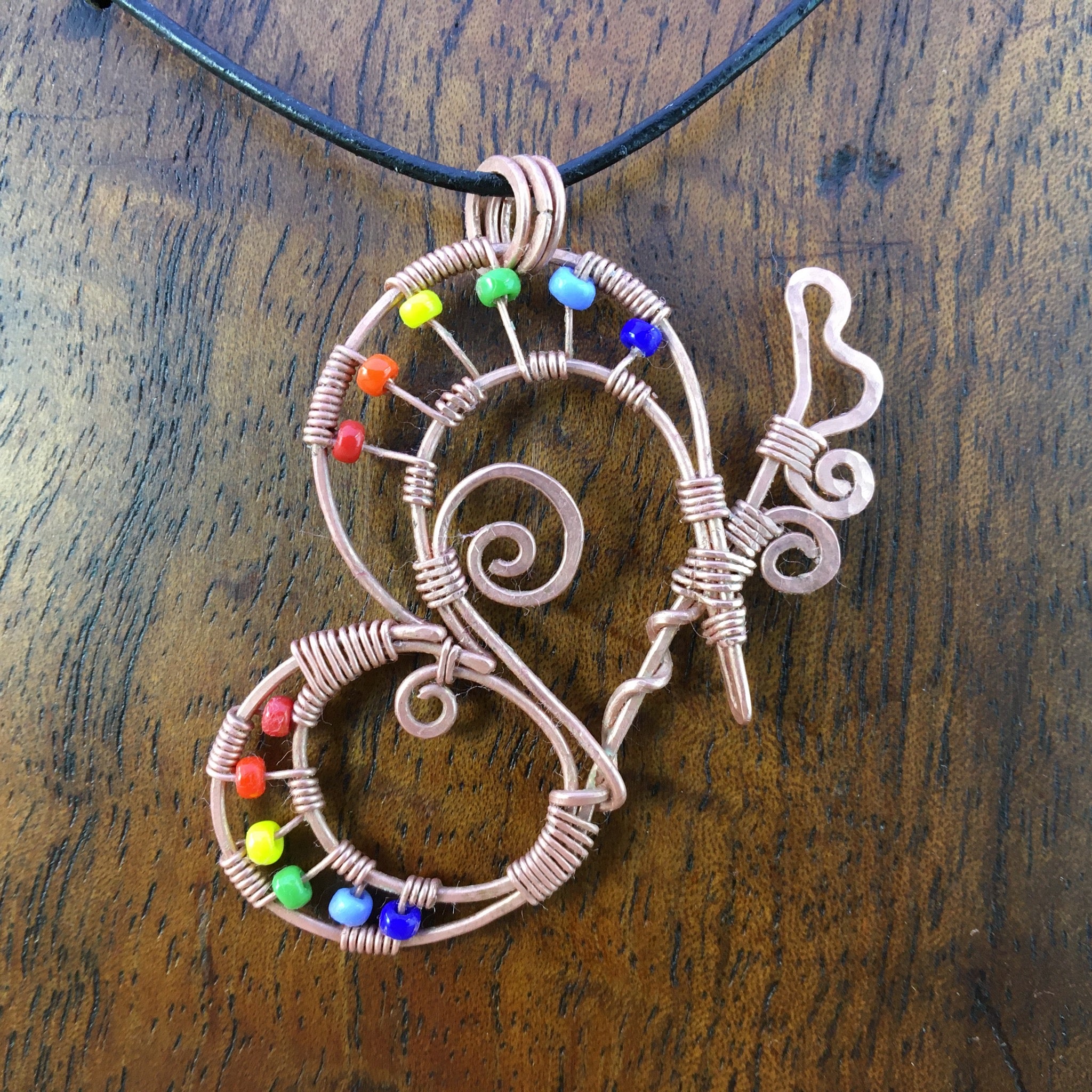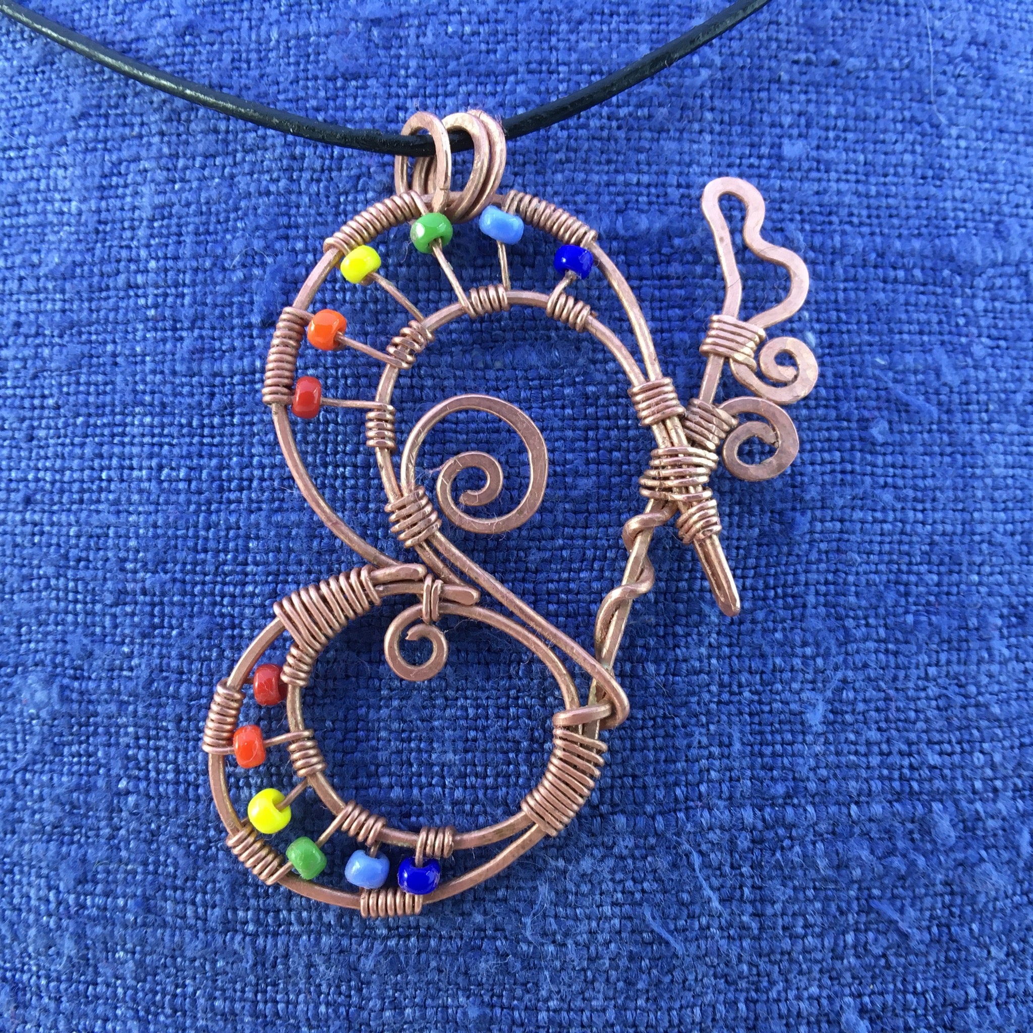 Don't you just love colourful butterflies? This wire-wrapped pendant was inspired by all the beautiful colour seen fluttering around our garden recently. It was hand-crafted using reclaimed copper wire and glass seed beads.