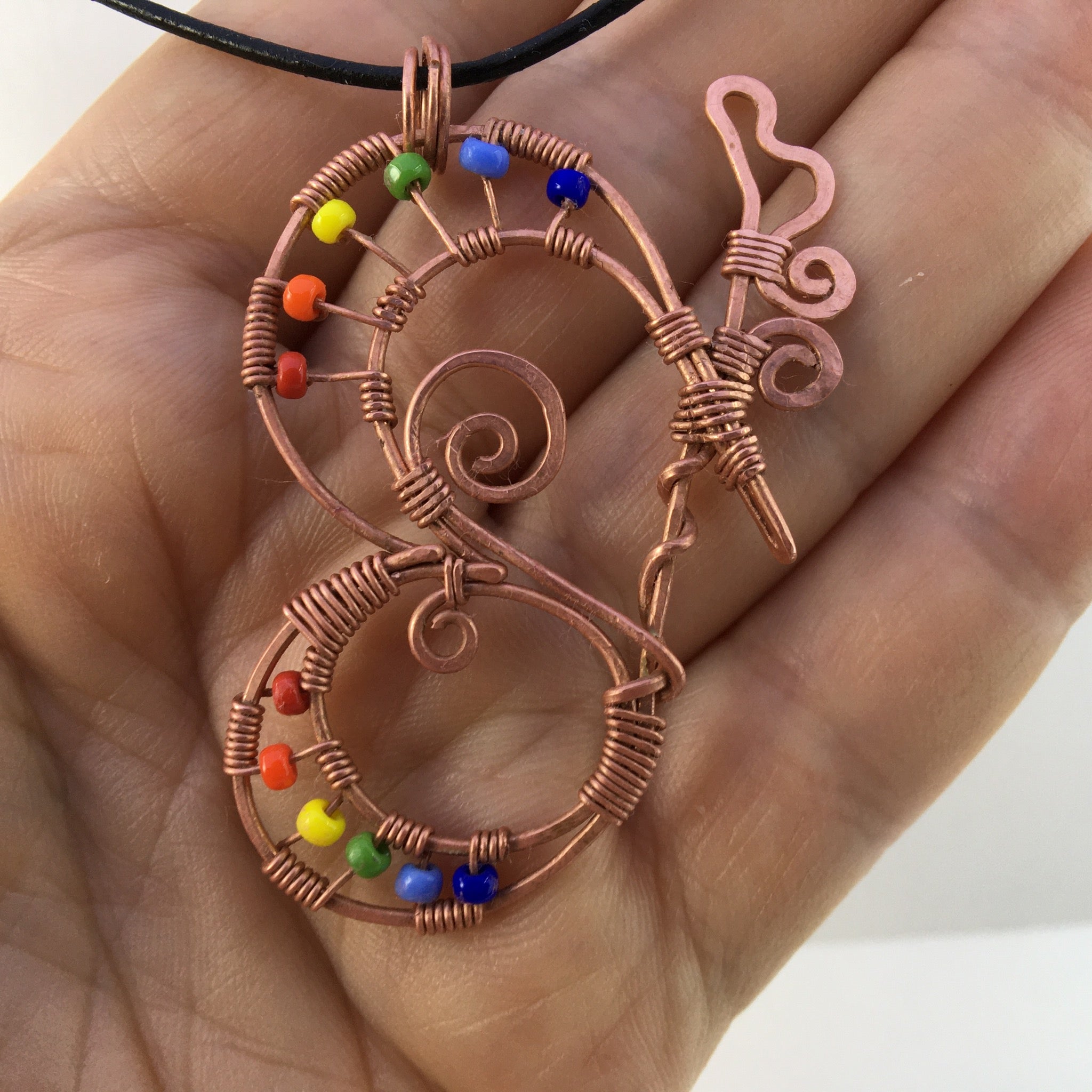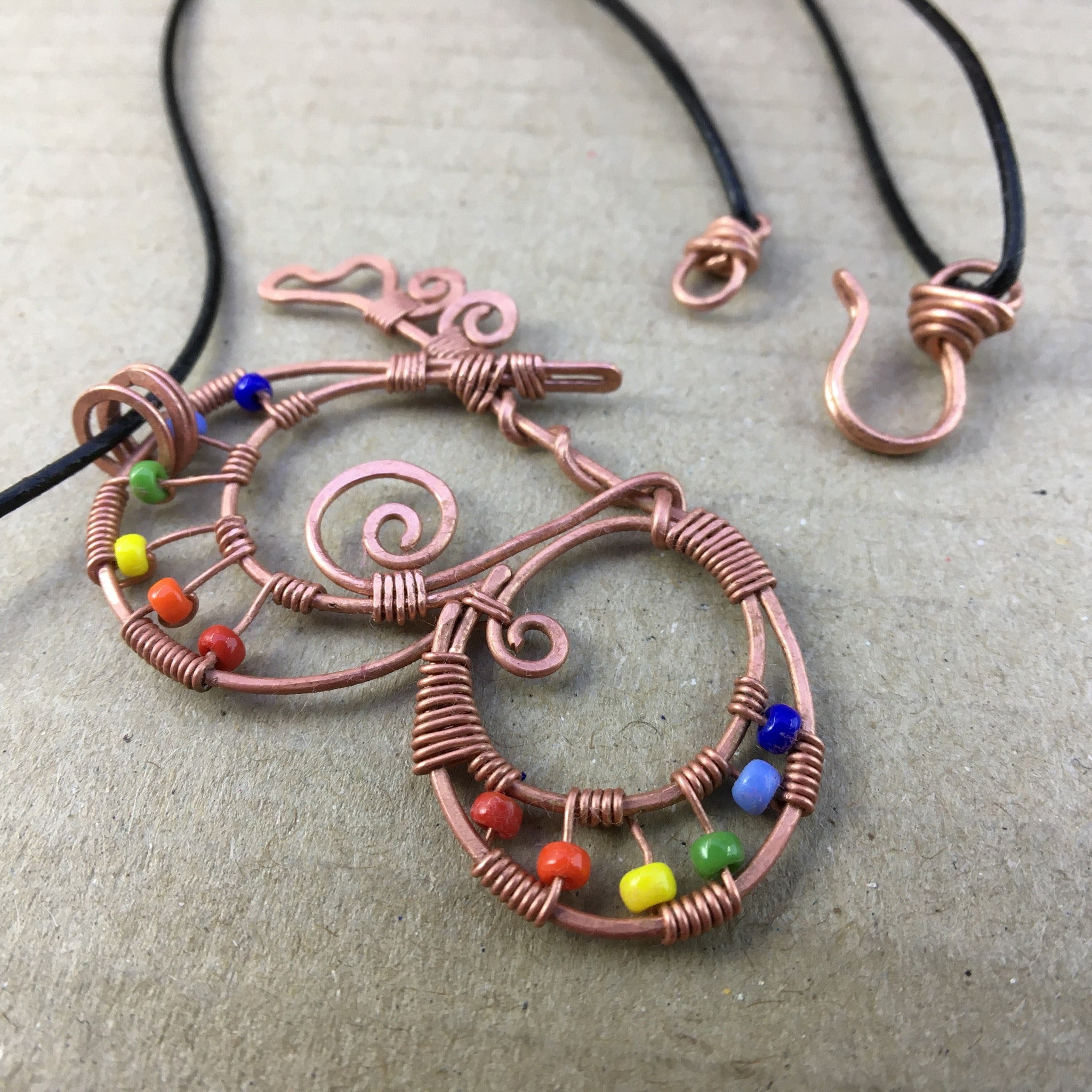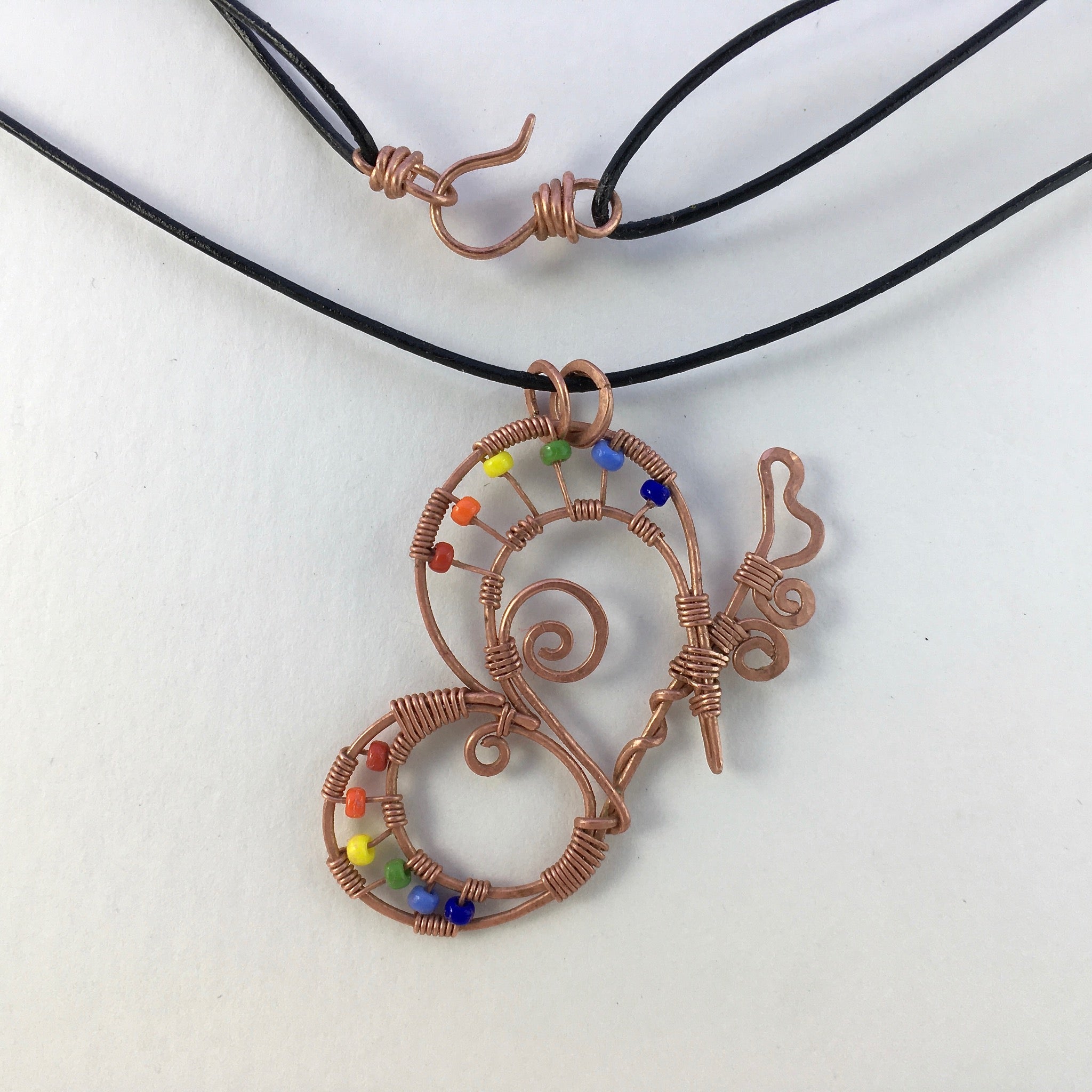 Don't you just love colourful butterflies? This wire-wrapped pendant was inspired by all the beautiful colour seen fluttering around our garden recently. It was hand-crafted using reclaimed copper wire and glass seed beads.