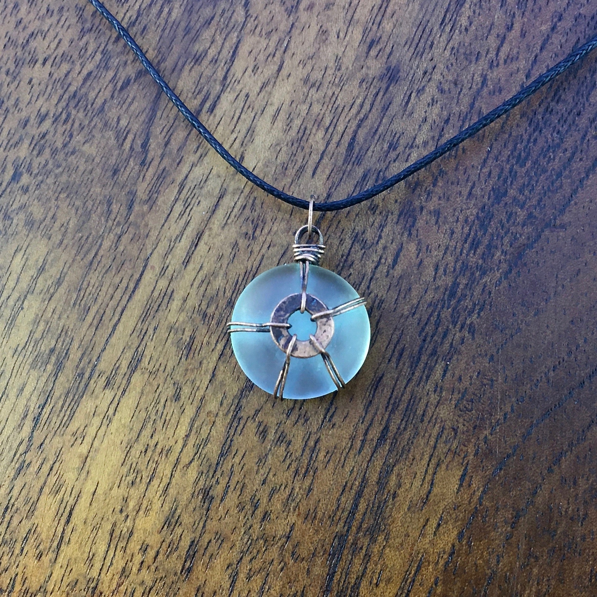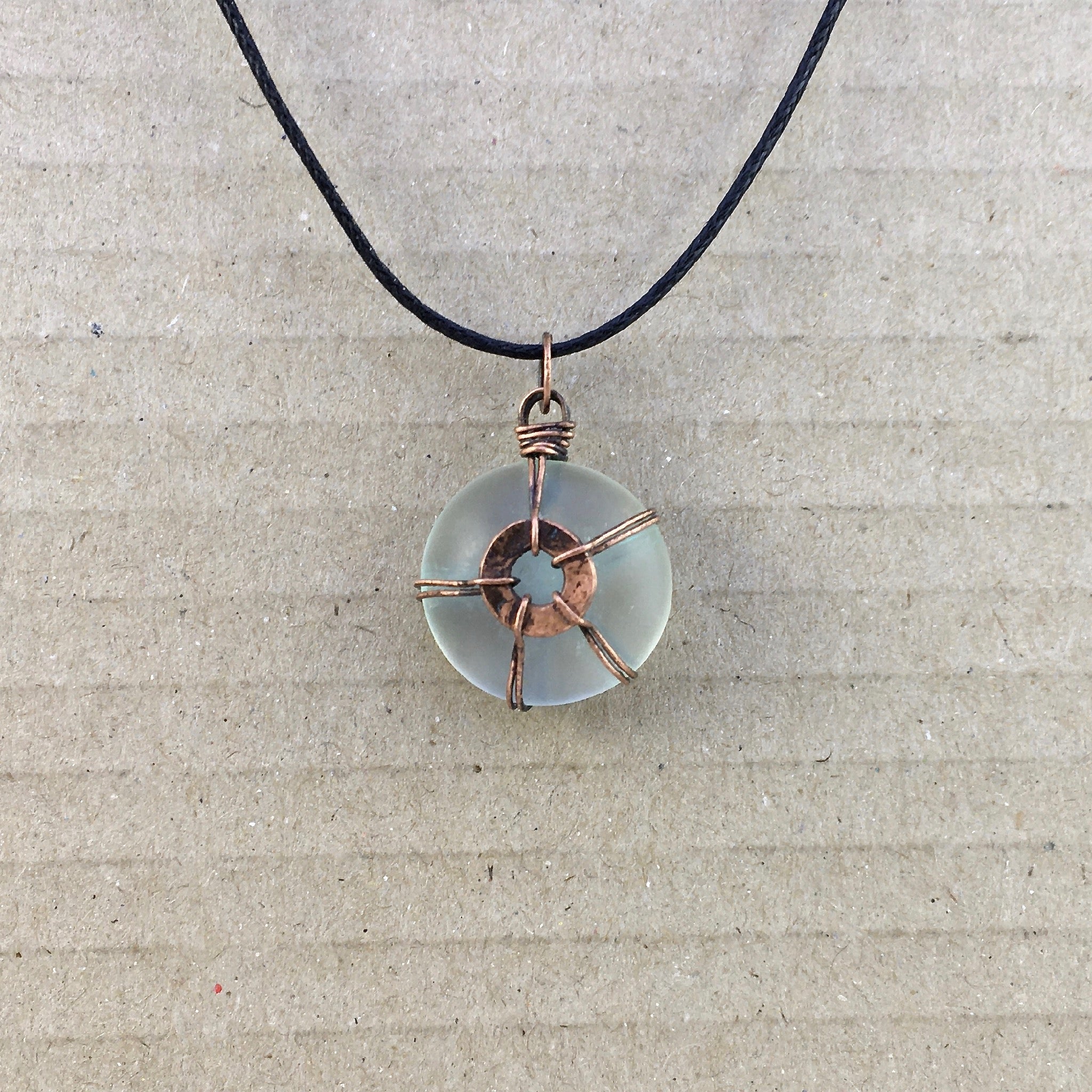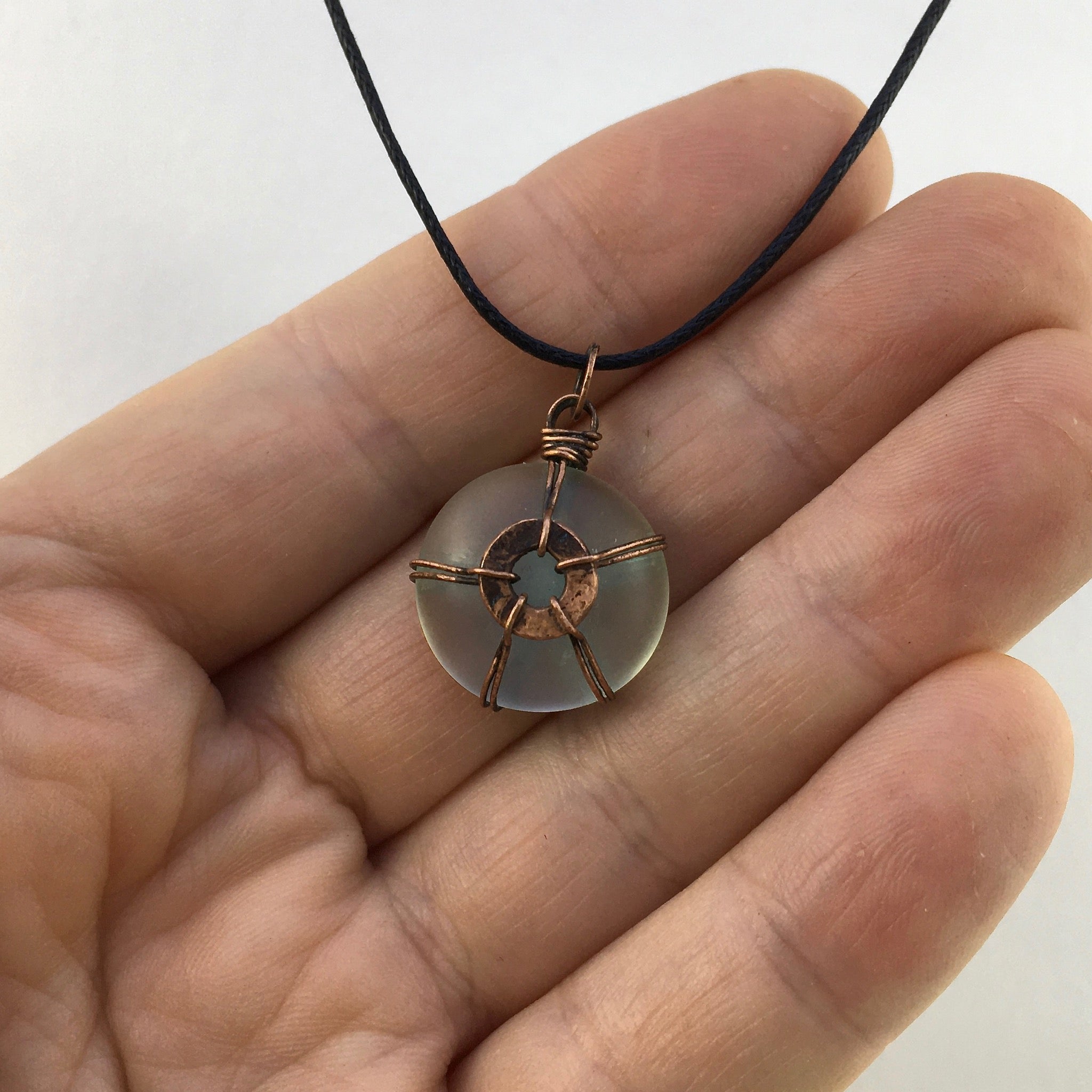 This small pendant was hand-crafted using reclaimed copper wire and a frosted glass cabochon.