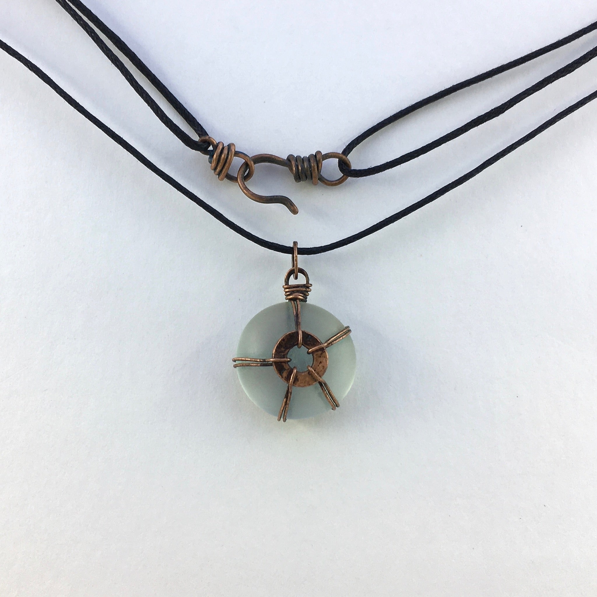 This pendant includes an adjustable length necklace made from waxed braided cotton with a hand-made copper clasp.